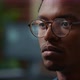 Portrait of software developer with vfx of running code reflected in glasses reading algorithm working focused looking at computer screen. Focus on moving eyes of coder typing in front of monitor.