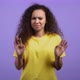 Portrait of woman showing rejecting gesture by stop finger sign. Dont interesting, do not offer. Severe girl in yellow t-shirt isolated on violet background. High quality 4k footage