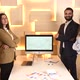 Portrait view of the happy smiling multiracial team sitting at the table and looking at the camera with smile. Successful and confident diverse colleagues concept