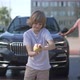 Positive boy squeezing sponge looking back at man gesturing thumb up in slow motion smiling. Portrait of confident Caucasian son posing at car wash service cleaning vehicle with father outdoors