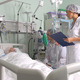 Dolly shot of a senior woman lying in emergency room or intensive care unit on an artificial lung and IV drip after a complected operation. Patient is conscious and talking to two young physicians, man and woman, taking care of her. Doctors asking about her wellbeing, and young woman explaining diagnosis or procedures to the elder woman. This footage symbolizes tactful attitude of medical staff towards the patients and is perfect for such themes as post-surgery, geriatrics, resuscitation and recovery, special referral center, hospital, etc.
