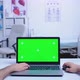 Pov of assistant using laptop with copy space available in hospital cabinet and doctor working on computer. Medic using notebook with chroma key on display in medical clinic.