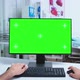 Pov of health physician working on computer with chroma key in hospital cabinet and doctor leaving the clinic office. Medical physician in clinic cabinet working desktop with copy space available.