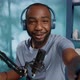 POV of influencer vlogging in studio and talking with microphone to subscribers. Vlogger holding camera to record video for vlog channel, using headphones. Man with podcast gear