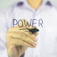 Man, businessman , employee draws and writes on transparent screen : Power