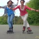 Two cheerful girls rollerblading together and doing a trick with crossed legs in super slow-motion
