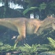 A predatory Tyrannosaurus Rex dinosaur sneaks up on its prey in the morning green jungle. View of the green prehistoric jungle forest on a Sunny morning.
