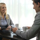 Man showing sketches on digital tablet screen and woman approving them