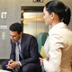 Three business partners leaving elevator and accommodating in armchairs of hall for discussion