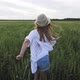 Pretty child in the hat is running across the wheat field. Happy young girl running in the field at sunset. Freedom concept