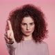 Pretty girl disapproving with no crossing hands sign make negation gesture. Denying, Rejecting, Disagree, Portrait of woman on pink background