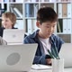 Tracking shot of two primary school students sitting in information technology class and typing something on laptop computer