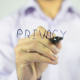 Man, Businessman, entrepreneur, freelancer, designer, stock trader, analyst or banker writes on transparent wall : Privacy