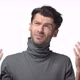 Problematic situation. Slow-motion indecisive puzzled and confused handsome bearded male in turtleneck, shaking hands dismay, frustrated, cant undertstand, standing clueless white background.