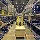 Professional Autoloader Operator Transporting Box Between Racks in Storage