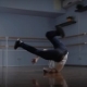 Professional breakdancer performs complex dance exercise on the floor of the dance studio. Young boy spinning on the floor. Direction of contemporary dance. Slow motion.