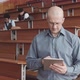 Medium slowmo portrait of confident male mid-adult university professor in smart casualwear with digital tablet in hands standing in big auditorium with students sitting in rows at desks in background