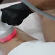 Hardware massages of female hip close-up. Anti-cellulite thigh machine cosmetology. Program for health and slimming. Apparatus figure correction.