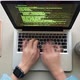 Flat lay of unrecognizable freelancer sitting at desktop and typing software code on laptop keyboard