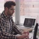 Side-view medium shot of bearded Mixed-race programmer in casualwear and eyeglasses writing program code on computer sitting at desk by window in modern office