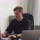 PAN waist up shot of young Caucasian male programmer with tattooed arms rubbing his eyes and stretching in chair during desk work in front of laptop