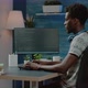 Programmer using binary code for website interface development on computer. Person coding system for cybersecurity with firewall data. Coder programming security for software app