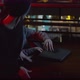 Medium shot of two hackers sitting down at café table, putting laptop on it and starting coding