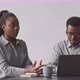 Waist-up shot of couple of young African-American programmers discussing new software development on laptop sitting by desk against grey wall in office
