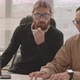 Waist up slowmo shot of two young multiethnic programmers in eyeglasses having conversation at workplace while looking at computer screen