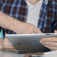 Close up of three unrecognizable cropped men working on a project using wireless digital device