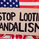 Protester holds a poster with inscription – stop vandalism and looting – against the background of the USA flag. Fighting against racism, for equal rights in the USA