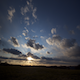 This is a wide open field with the sun setting. the puffy clouds roll across the landscape. blue and colorful with green grass.