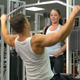 Bodybuilders pumping up arm muscles with the help of a weightlifting machine