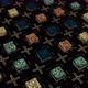 QR code abstract technology background, seamless loop. Animation. 3D futuristic pattern with the straight rows of squares with qr codes divided by crosses on a dark background