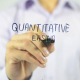 Man, Businessman, entrepreneur, stock trader, analyst or banker writes on transparent wall : Quantitative Easing