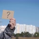 Question mark. Woman with a question mark on the background of the city.