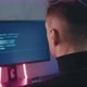 Portrait of young man programmer coding network security software indoors in neon lights. Hacker typing code on computer screen in dark office at night