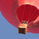 Red hot air balloon rises slowly in the air. In a gondola unrecognizable person operates a gas burner flame