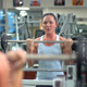 Young woman lifting a barbell reflecting in the mirror, change of focus