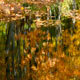 Reflection of autumn bright trees in lake. Falling leaves on the water surface in the reflection creates the effect of soaring up leaves