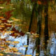 Reflection of colorful autumn maple leaves and trees on the shore of the lake. The leaves fall to the surface of the water, creating beautiful patterns..
