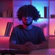Refusing man. Meme expression. Negative answer. Hipster guy shaking head saying no sitting work desk in dark neon light room interior looped.