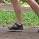 Side view of female legs in running shoes jogging on path in forest in slow motion