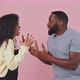 Relationship problems. Emotional african american man and woman arguing, shouting at each other over purple studio background