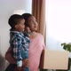 Relocation Concept. Black woman with son on hands walking in new flat, african american single mother holding cardboard box and look around, checking rooms after moving to new home, slow motion
