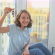 Relocation concept. Headshot of excited female moving in new home or apartment. Cheerful caucasian woman homeowner looking at camera and showing keys with keychain in her hand