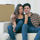 New repair and relocation. Loving couple enjoys a new apartment and keep the box in his hands while young and beautiful couple in love sitting on the couch in an empty apartment among boxes