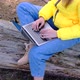 Remote work or study. A top view of the woman using a laptop sitting on a log in forest in a yellow jacket and jeans. Girl typing fast. 4k.