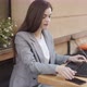 Beautiful brunette businesswoman working on laptop in outdoors cafe