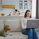 Remote working process. Indoors shot of woman working online on laptop, her son watching videos nearby, husband and daughter studying on background